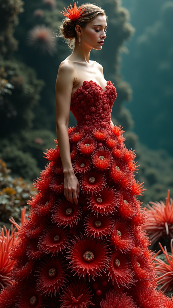 View this AI-generated image featuring a hyper realistic portrait of a goddess with flawless features draped in an exquisite floor length vivid red gown made entirely of intricately arranged sea urchins and swaying anemone tentacles the composition captures her ethereal essence with stunning depth o