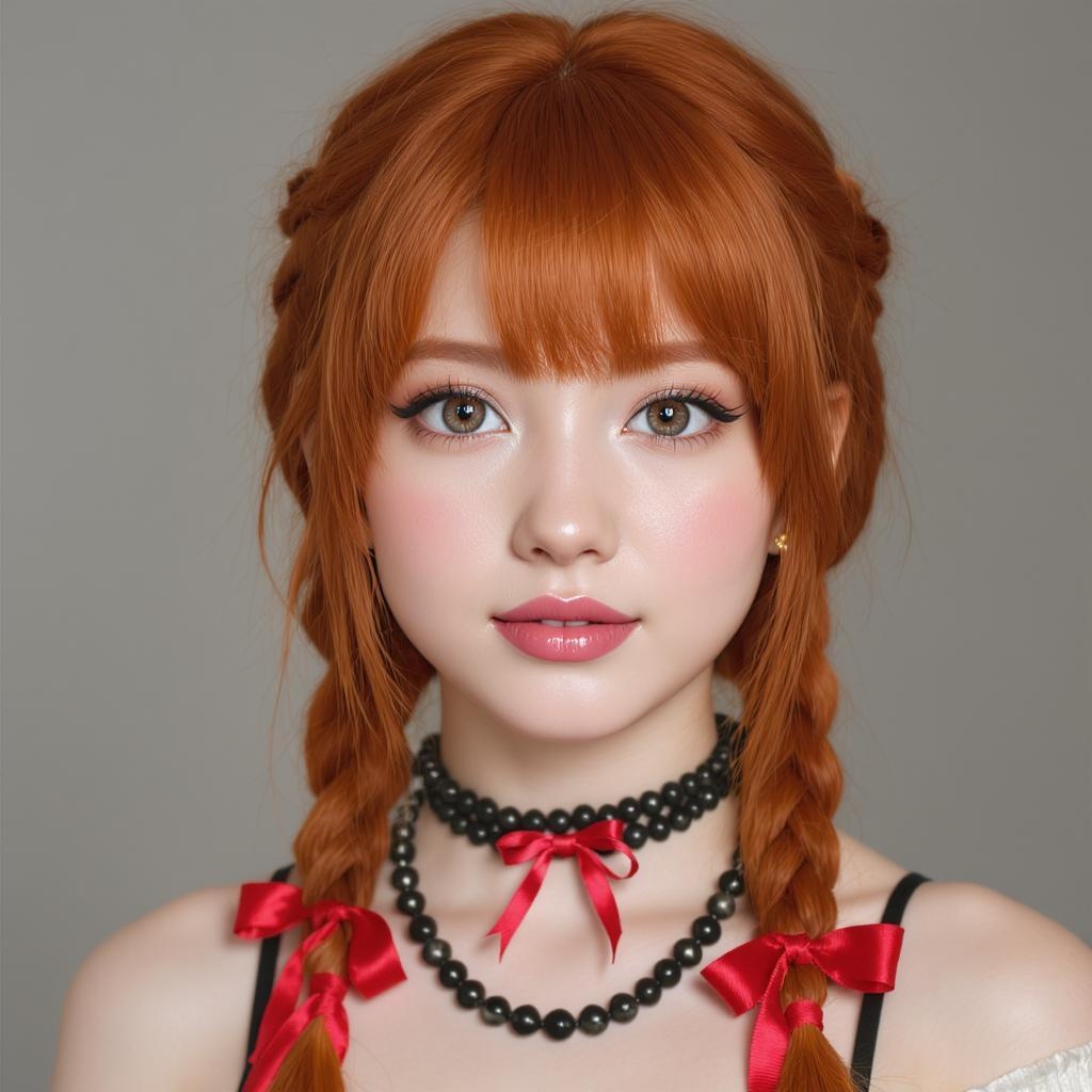 Portrait featuring a person with red hair styled in braids, showcasing a cute, expressive face with soft, pale cheeks and smooth skin. The subject wears a black beads necklace complemented with a red ribbon. The image boasts perfect composition and is hyper-realistic, with intricate, highly detailed features, including remarkable detailed pupils. Captured with a cinematic camera for a studio photo feel, the shot is in high quality 8k with HDR, emphasizing sharp focus and intricate details. The portrait is inspired by trending art styles and artists like Greg Rutkowski with an emphasis on texture and lifelike representation.