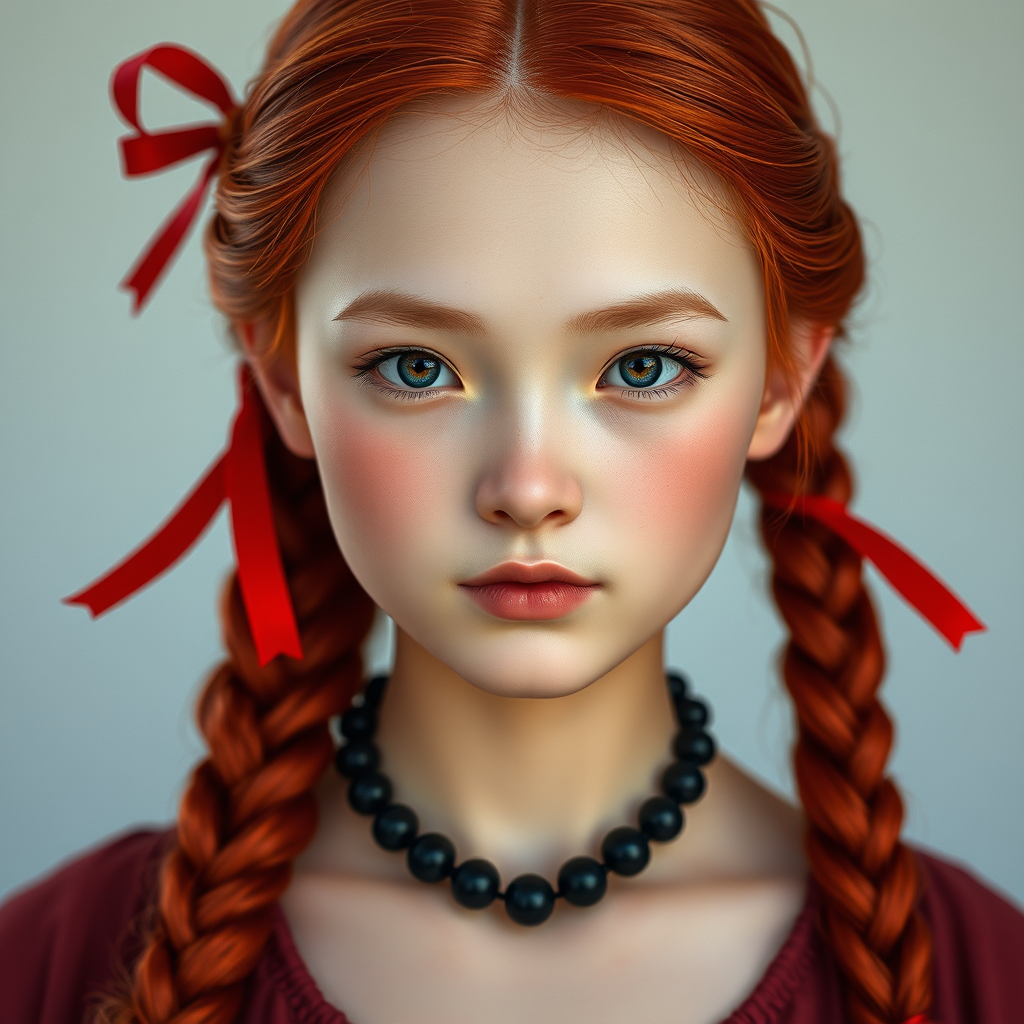 Portrait featuring vibrant red hair styled in delicate braids, adorned with a charming black bead necklace. The figure's face is endearing and youthful, with soft pale cheeks and flawlessly smooth skin. A striking red ribbon weaves through the hair, adding a touch of color contrast. The composition is perfect and hyper-realistic, showcasing intricate details, from the remarkably detailed pupils to the textured skin. Captured in high definition, the image reflects the quality of a studio photo shoot with sharp focus and cinematic flair. Enhanced in post-production for 8k resolution, the portrait boasts ultra-high definition and high dynamic range, seamlessly blending Greg Rutkowski’s renowned attention to detail with creative elements that bring the subject to life. The overall aesthetic is rich, vivid, and artistically compelling, ensuring its place among trending art on platforms like ArtStation.