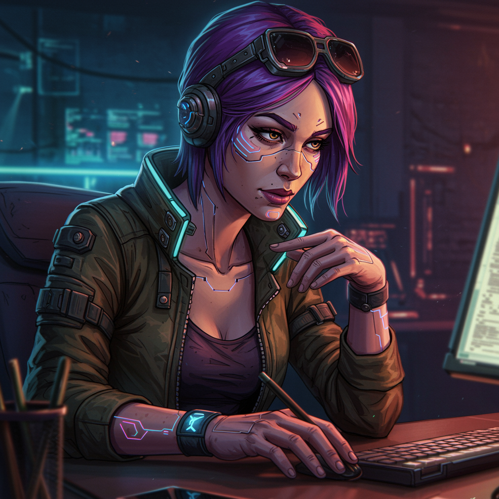 A close-up portrait of an inspired female cyberpunk biohacker working at her desk, featuring a vibrant and intricate design with sharp focus, volumetric atmosphere, and high resolution. The scene showcases a beautiful face and delicate hands, captured in stunning detail with neon accents, reminiscent of the Borderlands aesthetic. The artwork exhibits precise linework and comprehensive cinematic quality, aiming for maximum detail and 4k ultra-high definition. This digital art piece serves as a key visual, suitable for award-winning features and trending on art platforms. Excludes elements such as low-resolution images, text errors, missing or extra digits, and poorly drawn anatomy. No sunglasses, watermarks, or artist signatures are present, ensuring a clean and immersive visual experience.