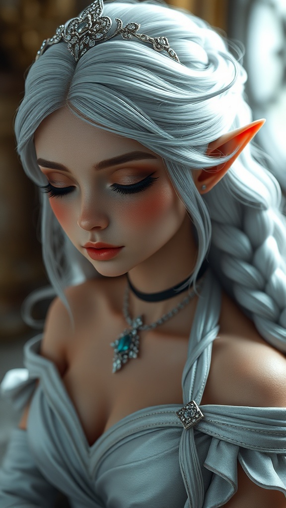 portrait of an elven girl, face close up, angular ears, elegant gown, eyes gently closed, adorned with jewels, seated posture, off-shoulder attire, delicate shoulders, sparkling tiara, silver dress, hint of neckline, flowing locks, intricately braided silver hair, elongated lashes, single view, elf character, modeled in 3D, softly blurred, text elements, slight jpeg distortion, softly focused, individual depiction, artistic reference, voluminous and strong physique, slight vision divergence