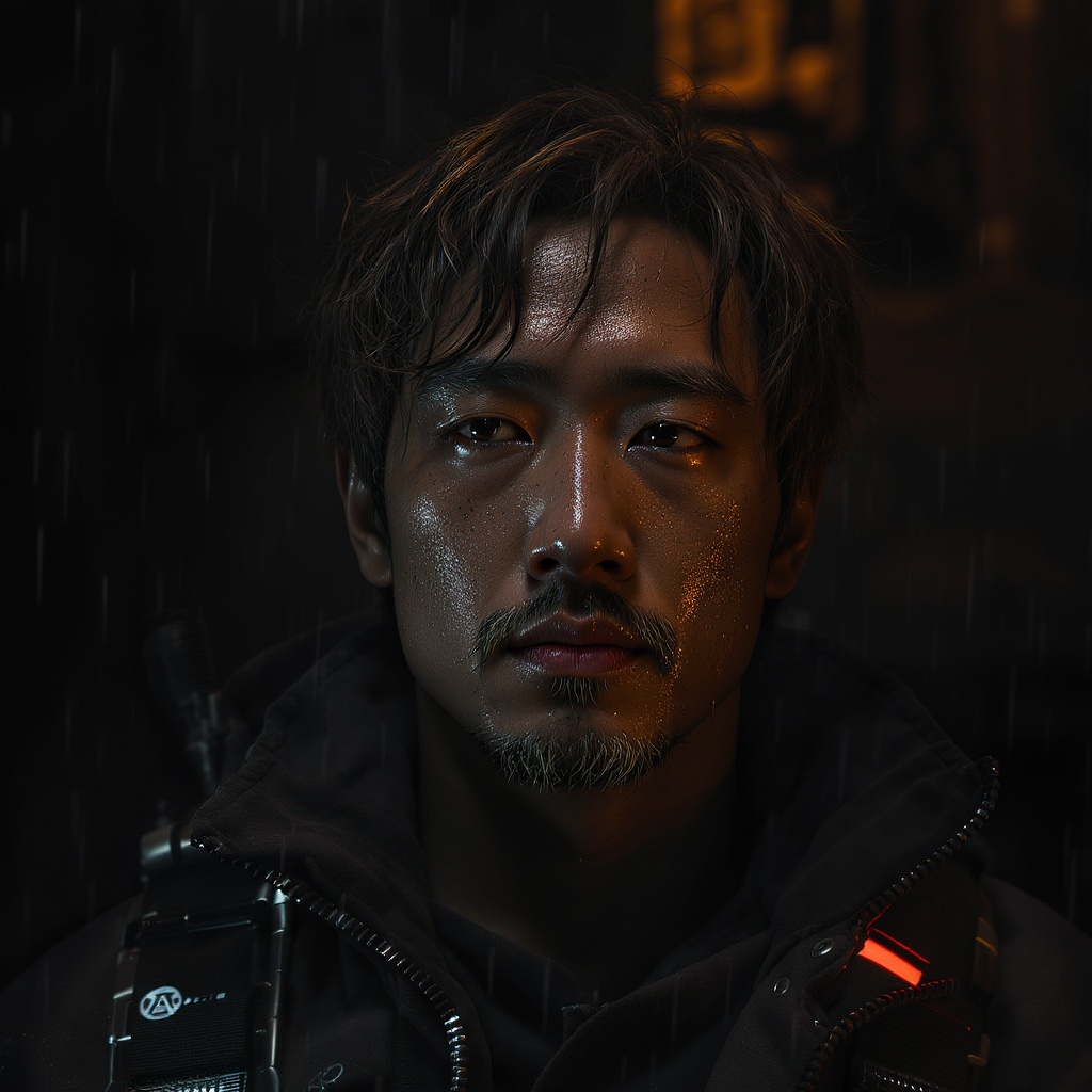 A cinematic portrait of a ruggedly handsome 30-year-old Asian man with a stunningly detailed and slightly dirty face, displaying a mysterious yet peaceful expression. His hair adds to his allure, set against an oppressive yet contrasting background that conveys a dramatic sci-fi atmosphere. The scene is backlit from within, creating an expressive and gloomy ambiance, captured from a low angle with a DSLR camera. The technical details include an aperture of f/7, shutter speed of 1/100 sec, and ISO 150, ensuring hyper photorealism with super detailed textures and natural reflections. The cinematic lighting enhances the scene's depth and mood, avoiding any deformations or anatomical inaccuracies, while maintaining high resolution and polished quality.