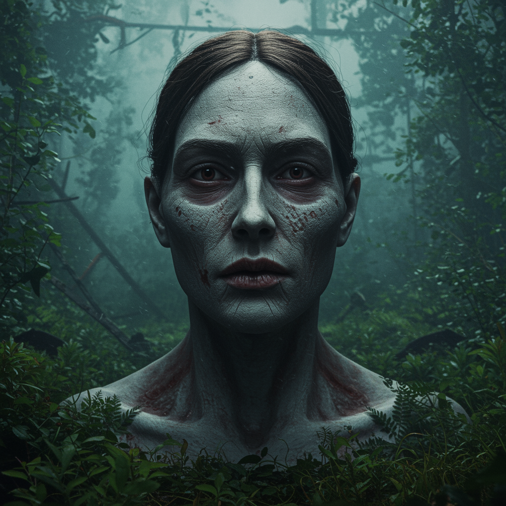 A striking portrait of the Horseman of the Apocalypse - Hunger, set against a lush but ominous environment, shrouded in fog with an undertone of industrial metal. The detailed face is haunting yet captivating, capturing the essence of insatiable desire amidst scarcity. Cinematic lighting casts dramatic shadows and highlights, enhancing the tension between abundance and deprivation. The scene embodies apocalypsecore, where nature and ruin coexist. Imagined through the lens of Annie Leibovitz, the composition is rich in character and depth, while retouched by Pratik Naik, intricacies and textures are meticulously enhanced, creating a timeless yet disturbing image.