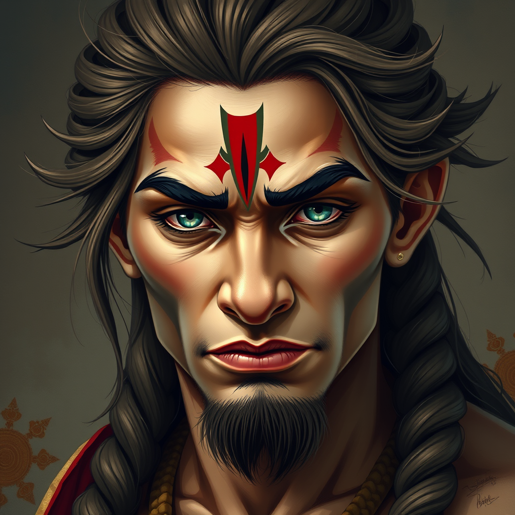 Portrait, image, androgynous Hanuman, angular jaw, refined features, stunning visage, braided hair, flowing bangs, extended ponytail, vivid aqua eyes, Indian artistic style.