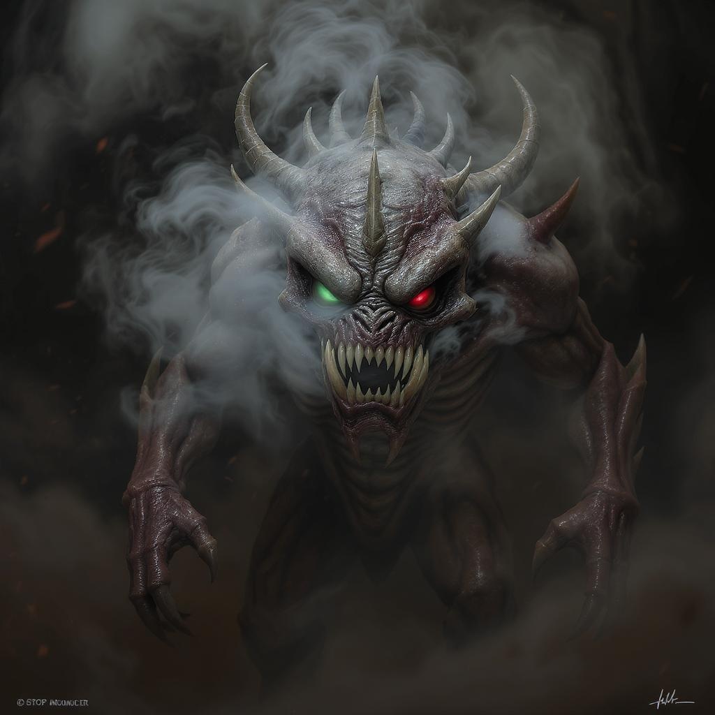 Portrait image of a menacing creature known as the stop monster, positioned prominently with a front-facing stance in sharp focus, enveloped by swirling volumetric fog. The creature emanates a sense of urgency as if to signal retreat, return, depart, and halt, presenting a warning to all who encounter it. Its features are meticulously detailed, exuding a sense of symmetry and balance that both captivates and intimidates. The atmosphere around it is tense, urging viewers to pause and consider their next move carefully.
