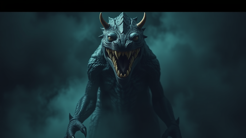 Portrait image of a stop monster, retreating, leaving, returning to sender, issuing a warning with its presence, commanding halt and wait, featuring a front-facing pose, in sharp focus amidst volumetric fog, highly detailed features, with a sense of symmetrical balance, nfixer-inspired elements subtly integrated.