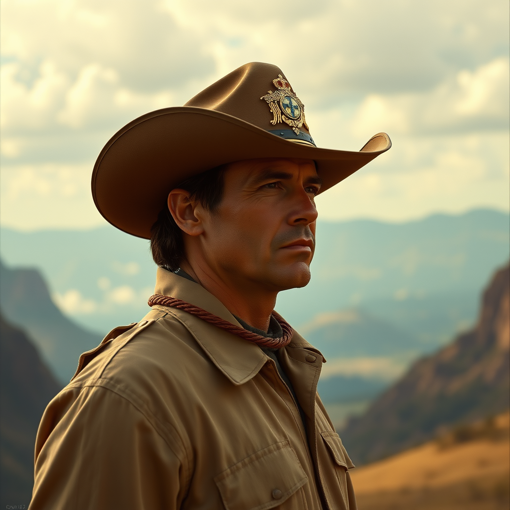 Portrait in the grandeur of a post-'70s ego era, a figure stands in full body view capturing the essence of rangercore with a hint of royalcore sophistication; a majestic landscape unfolds behind, as if the scene is set in an expansive theatre of nature. The photograph is rendered in the vivid hues and rich contrasts of Provia film, emphasizing the elegance and scale of the subject. Using the realistic detailing akin to UE5 graphics, the figure embodies strength and poise, blending seamlessly with the grand backdrop that tells a story of timeless adventure and imperial grace.