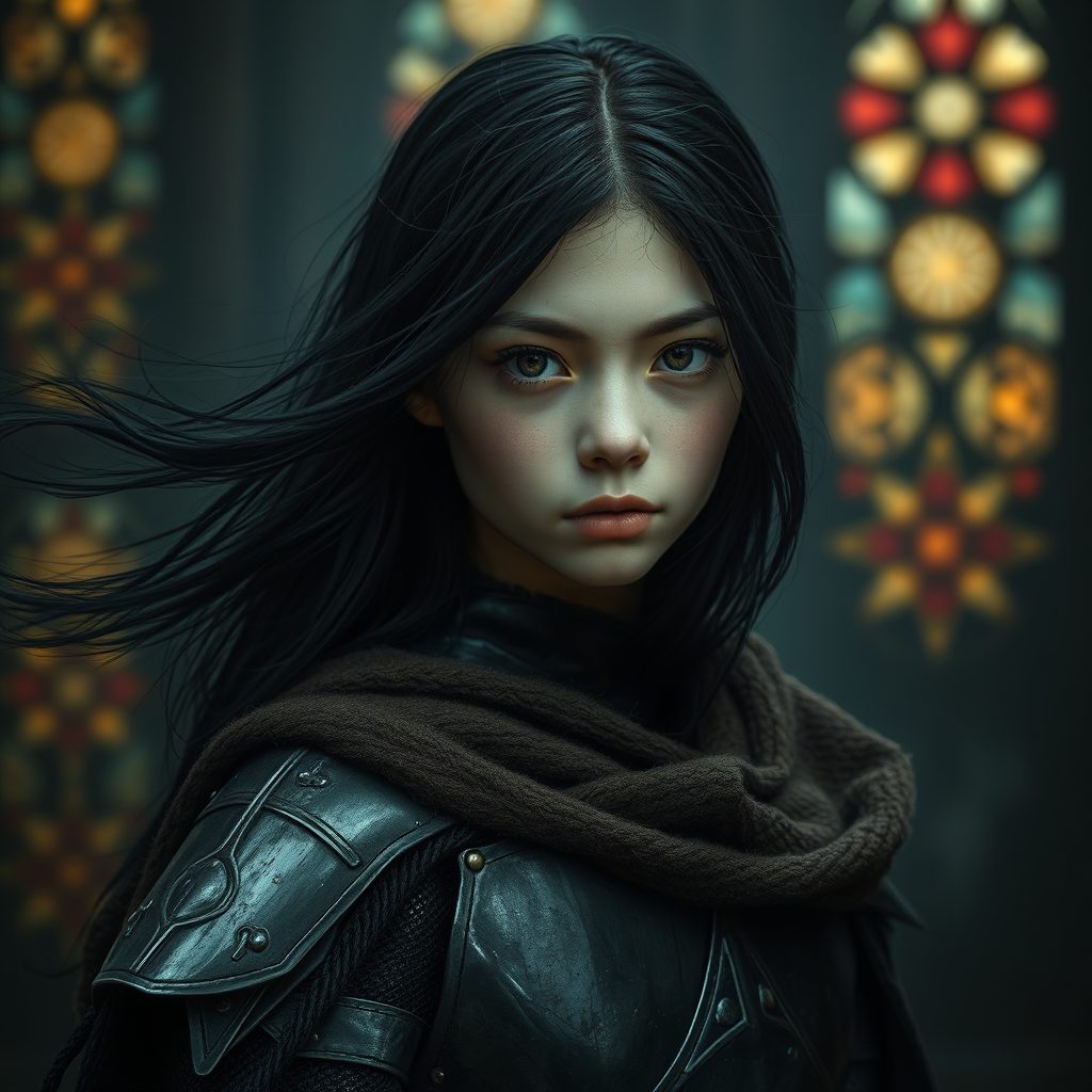 Portrait in three-quarter close-up, dark fantasy film style, mesmerizingly beautiful slender girl, innocent and pure expression, flowing black hair, worn black knight armor crafted from blued steel, superbly detailed tattered dark brown wool cloak with a coarse weave, stained glass elements, a dramatic and eerie background, creating a gloomy atmosphere, intricate natural textures with expressive details, stunning hyperphotorealism, capturing natural daylight with reflections and intricate stained glass light play, cinematic lighting, aura of mystery, invoking anime-like eyes with captivating symmetry, exposed skin on arms and neck, avoiding any anatomical distortions or unnatural features, ensuring high-quality and lifelike depiction, embracing natural light nuances and circular motifs reminiscent of stained glass artistry, exuding an enigmatic presence amidst a mystical and shadowy environment.