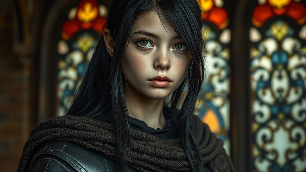 Portrait in three-quarter close-up, dark fantasy film style, stunningly beautiful slender girl, captivatingly innocent face, long black hair, worn black knight armor made of weathered steel, intricately detailed tattered dark brown wool cloak with a coarse weave, set against a stained glass backdrop, ominous and eerie atmosphere, natural swirling textures, expressive and detailed background, hyper-realistic with natural daylight reflections, rich textures, and stained glass illumination. Emphasizing cinematic lighting, with natural light accentuating round window designs, adding ethereal qualities to the scene. Avoiding any unnatural or exaggerated features, ensuring anatomical correctness and harmonious proportions, rejecting elements that detract from the natural and artistic essence of the image. The character exhibits a serene yet mysterious allure, seamlessly blending fantastical elements with realistic traits for a truly immersive visual experience.