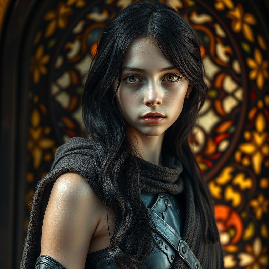 Portrait in three-quarter close-up, dark fantasy film style, stunningly beautiful slender girl, captive to a mysterious allure, with naive and innocent features, cascading black long hair, and wearing shabby black knight armor crafted from blued steel. Her attire is completed by a tattered dark brown wool cloak with a coarse weave, enhancing the sense of a worn-out journey. The backdrop is composed of intricate stained glass, accentuating a dramatic, gloomy, and eerie atmosphere. The natural funnel texture in the background provides an expressive, hyper-detailed setting, all illuminated by natural daylight. The use of natural reflections and textures along with stained glass in natural lighting adds depth, while cinematic lighting casts a dynamic shadow play across her features. Her naked arms and neck subtly peek through, emphasizing vulnerability without overt exposure, maintaining a tasteful intrigue. The scene maintains its magical allure by avoiding visual pitfalls like anatomical distortions or disconcerting elements, focusing instead on a captivating, mysterious encounter.
