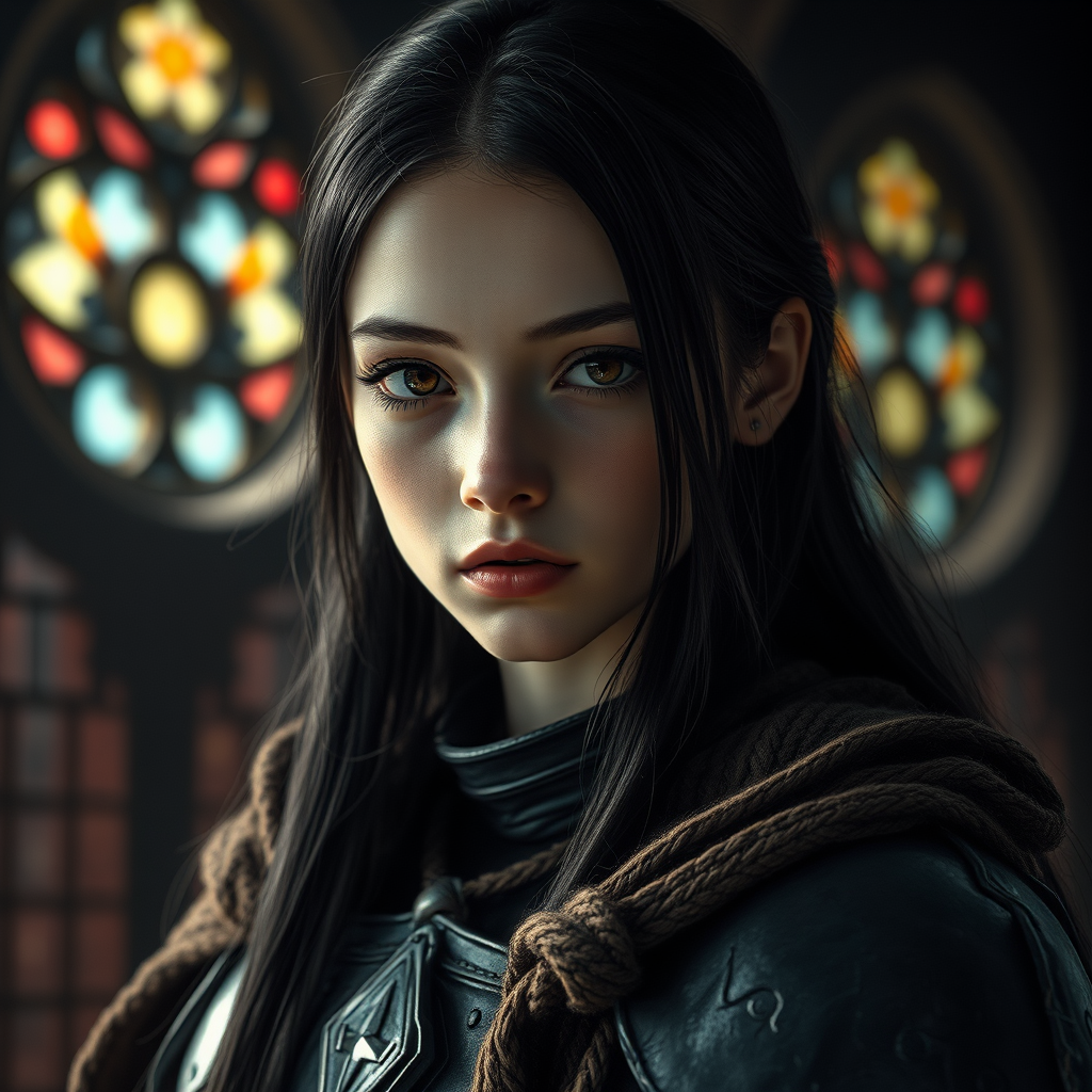 portrait in three-quarter close-up, dark fantasy film style, stunningly beautiful slender girl, stunning naive and innocent face, black long hair, shabby black knight armor made of blued steel, superbly detailed tattered dark brown wool cloak with coarse weave, stained glass, dramatic background, gloomy and eerie atmosphere, natural funnel texture, expressive background, super detail, hyperphotorealism, natural daylight, natural reflections, natural textures, stained glass natural lighting, color illumination, cinematic lighting, anime eyes, symmetry, natural light, round windows, subtle textures, mysterious ambiance, ethereal presence, softly focused eyes, graceful poise.