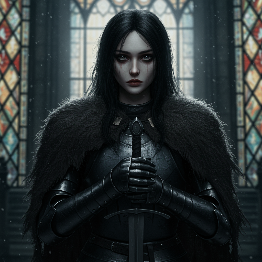 Portrait in three-quarter close-up, dark fantasy film style, featuring a stunningly beautiful slender girl with an innocent and naive expression. She has long black hair and wears shabby black knight armor made of blued steel. Her attire is complemented by a superbly detailed tattered dark brown wool cloak with a coarse weave. The dramatic background includes elements of stained glass, contributing to a gloomy and scary atmosphere. The setting is detailed with natural funnel textures and expressive high-definition backgrounds, achieving hyperphotorealism quality. Natural daylight casts reflections and textures, enhancing the stained glass's color illumination under cinematic lighting. Avoid elements like anime features, exaggerated anatomy or disfigurements, ensuring natural, symmetrical proportions. The environment is also free of unwanted elements, such as watermarks, oversaturation, and distortions, maintaining a lifelike and immersive experience.