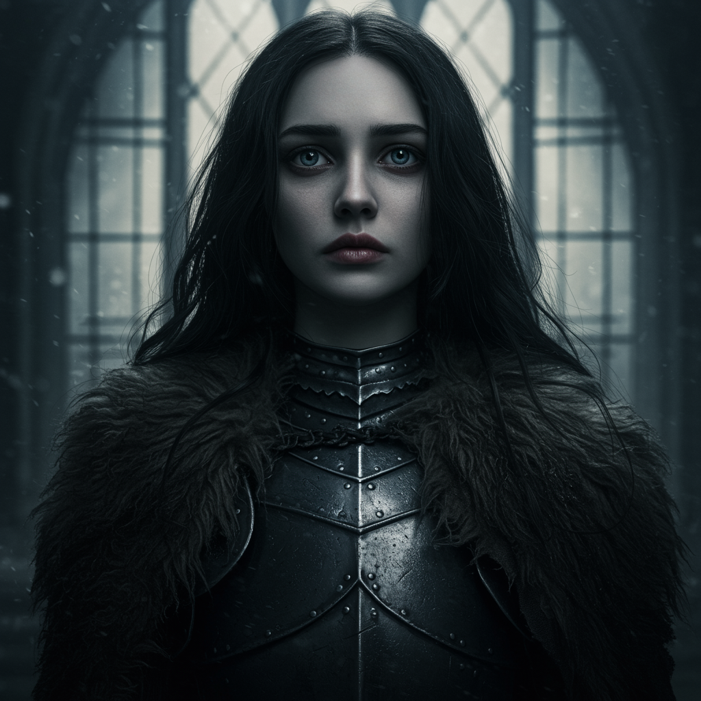 Portrait in three-quarter close-up, dark fantasy film style, a stunningly beautiful and slender girl with an innocent and naive expression. Her long black hair flows over shabby black knight armor crafted from blued steel. The armor shows the wear of countless battles and is covered by a superbly detailed, tattered dark brown wool cloak with a coarse weave. Behind her, a dramatic background of stained glass enhances the gloomy and scary atmosphere, brought to life by expressive detailing and hyper-realistic textures. Natural daylight filters through, reflecting off surfaces and casting intricate patterns of light, creating a cinematic lighting effect. Her eyes, large and full of wonder, reveal a depth of emotion, while her exposed arms and neck display a subtle vulnerability. The scene is devoid of deformities and distractions, focusing solely on the ethereal beauty and eerie ambiance. It captures the essence of dark fantasy with intricate workmanship and a hauntingly beautiful composition.