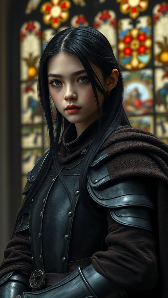 Portrait in three-quarter close-up, inspired by dark fantasy film style, of a stunningly beautiful slender girl with an innocent face and long black hair. She wears worn black knight armor made of blued steel, complemented by a superbly detailed dark brown wool cloak with a coarse weave. The setting features a dramatic background with stained glass, evoking a gloomy and mysterious atmosphere. The scene is rich in natural textures and hyperphotorealism, enhanced by natural daylight and cinematic lighting. The background includes expressive elements and natural reflections. There is a focus on symmetry and the subject's emotive clarity, avoiding anime or exaggerated features. The armor reveals her bare neck, arms, and hands, while maintaining a graceful, unblemished appearance. The overall effect is both haunting and captivating, achieving a balance of dark fantasy and high realism.