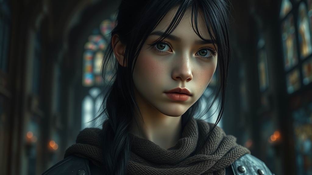 Portrait in three-quarter close-up, inspired by dark fantasy film style, featuring a stunningly beautiful slender girl with a naive and innocent face. She has long black hair and wears shabby black knight armor made of blued steel. Her tattered dark brown wool cloak with a coarse weave complements the scene. The background is dramatic and filled with stained glass, creating a gloomy and eerie atmosphere. Textures are highly detailed, with a natural funnel texture and expressive, super detailed environment. The setting is captured in hyperphotorealism, under natural daylight with cinematic lighting and natural reflections. Elements such as anime eyes, symmetry, and natural stained glass lighting contribute to the color illumination. Please ensure the portrayal remains free from deformities or exaggerated features, focusing on maintaining natural beauty and realism.