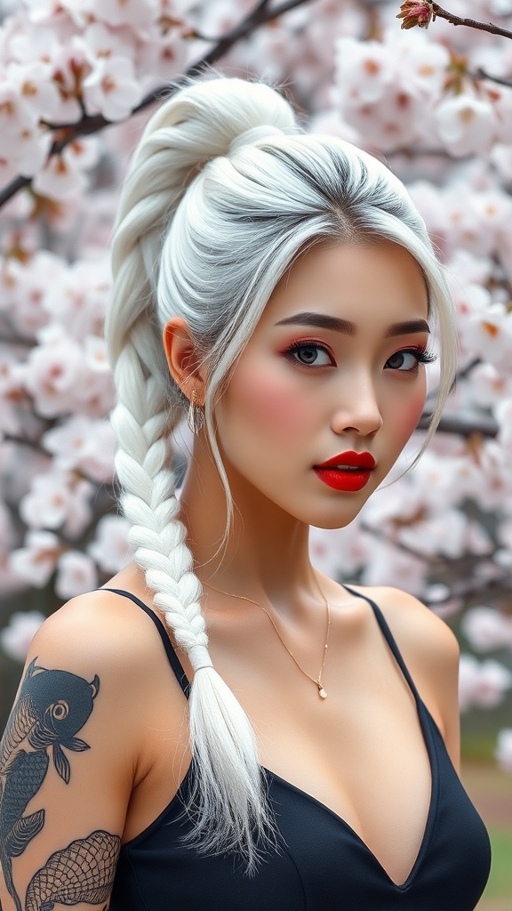 View this AI-generated image featuring portrait of a striking korean pop idol with a sleek platinum white braided ponytail intricate koi fish tattoo sleeves and bold crimson lips clad in a form fitting black sleeveless dress set against a stunning background of cherry blossoms in full bloom this ima