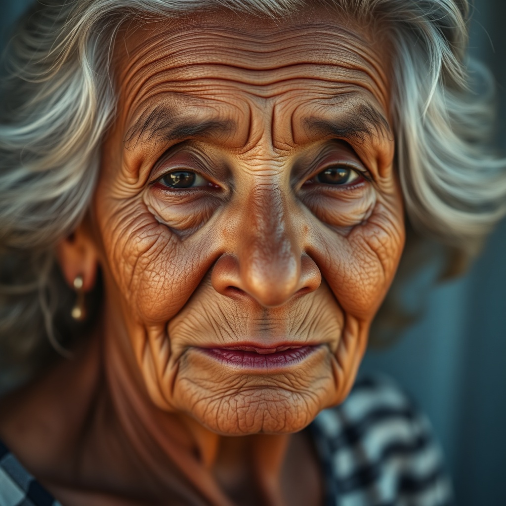 An intimate portrait of an elderly Latin American woman, her hair styled in soft waves framing a face marked by years of wisdom and gentle warmth. Her skin carries a sun-kissed glow, illuminated by natural light that highlights the intricate details of her features. Her eyes, expressive and serene, convey a lifetime of stories. The high-definition image captures every fine line and subtle texture with extraordinary clarity, resulting in a mesmerizing, life-like depiction in ultra-high-definition quality.