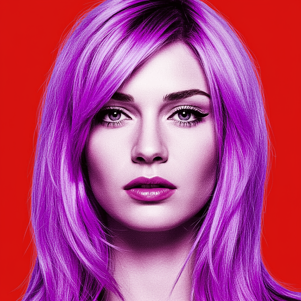 A dynamic portrait featuring a woman with vivid lavender hair, drawing inspiration from the iconic styles of Andy Warhol and Richard Avedon. This composition blends pop art's vibrant hues and striking graphic lines with the high-contrast and minimalist approach of classic photography. The woman's face is captured in sharp detail, her gaze intense and captivating, set against a bold, eye-catching background. The piece embodies a fusion of timeless and contemporary elements, reflecting the essence of modern pop culture.