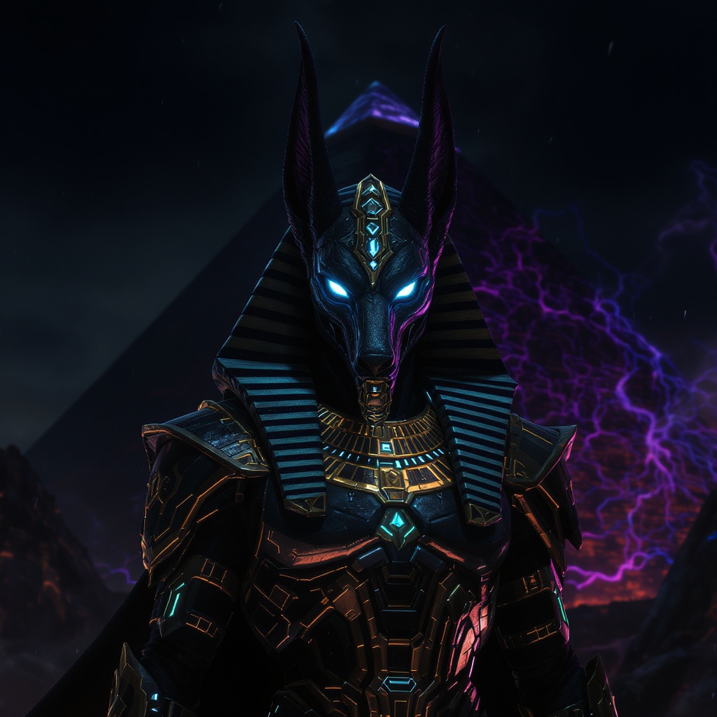 Portrait the Egyptian male Anubis in a cyberpunk setting, with emphasis on hyperrealism and intricate detailing. The scene involves a dark fantasy aesthetic featuring a black pyramid backdrop. Focus on creating hyperdetailed eyes that capture attention. This concept art should appear as an epic masterwork, reminiscent of a detailed matte painting by Greg Rutkowski, ideally suited for 8k resolution. Utilize dynamic lighting to enhance the scene, evoking an eldritch atmosphere. The work should feature hyperdetailed craftsmanship, particularly in the portrayal of Anubis, conveying a sense of intrigue and depth. Ensure the depiction is centered and well-composed, eliminating any elements such as out-of-frame body parts, blurry images, or strange anatomy. The figure should maintain a realistic and powerful stance, exuding an air of mystery and dominance within the cyberpunk realm.