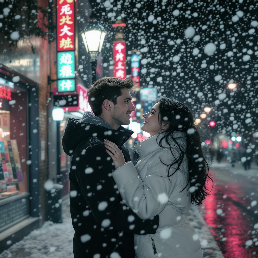 A realistic portrait of a young man with short brown hair and deep brown eyes and a young woman with flowing black hair and striking blue eyes standing together at night on a snow-covered street. They embrace warmly beneath a glowing streetlight, their expressions filled with wonder as they gaze up at the softly falling snowflakes. The scene is captured with a cinematic touch, featuring blurred neon signs of bustling shops behind them, creating a vibrant yet intimate urban backdrop. The night cityscape enhances the magical ambiance, with intricately detailed textures and shadows. The snow falls gently, adding to the serene, dreamlike atmosphere. The overall composition is meticulously rendered in extremely high detail, with an ultra high-definition resolution that captures the essence of this tender moment, bringing out the clarity and depth akin to cinematic photography.