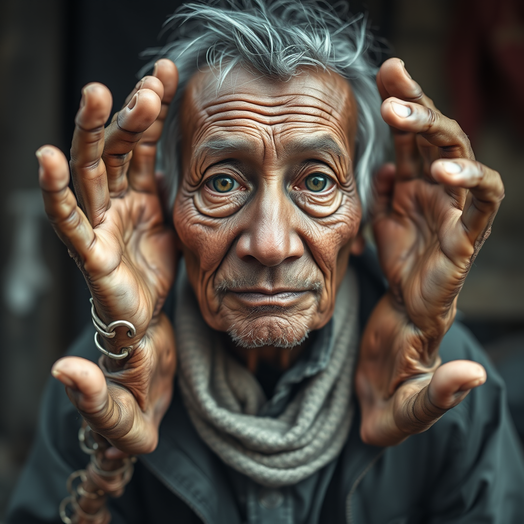 Portrait of a 50-year-old elderly fisherman with robotic eyes, captured in a professional medium shot using a Nikon Z9 at 100mm with f/1.8 aperture. The image features intentional imperfections such as blurry and fuzzy elements, with anatomical distortions including extra limbs and fingers. The hands and feet appear poorly rendered, with some elements disfigured and out of frame. The overall composition is characterized by a mixture of deformed and mutated visual aspects, offering a unique and abstract interpretation. The color palette is intentionally desaturated, adding to the surreal and distorted aesthetic.