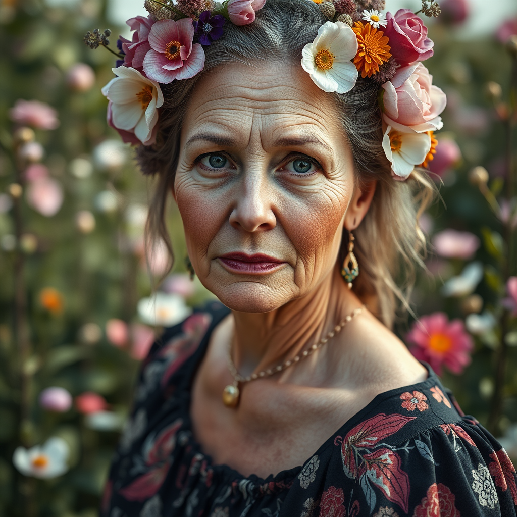Portrait of a 50-year-old large-boned woman adorned with flowers in her hair, set against an ethereal garden backdrop. The image draws inspiration from Anna Dittmann’s style, as seen on cgsociety — a blend of fantasy art and detailed photography. The composition makes use of a hip-level angle, captured with a Cinestill Hasselblad 50mm tilt shift lens, ensuring soft and delicate lighting. The scene is hyper-detailed and ultra-realistic, boasting 8K resolution and an intricate attention to detail. Her skin is rendered with lifelike pores and a matte texture, utilizing subsurface scattering to highlight realism. Shadows are heavy yet artistically balanced, contributing to a studio photography ambience. There are no discernable errors, text artifacts, or quality degradation such as jpeg artifacts, maintaining a pristine and polished appearance. The woman's expression captivates with realistic proportions, avoiding any deformations or disfiguring elements, ensuring harmonious and natural aesthetics while keeping creative freedom within the original concept's confines.