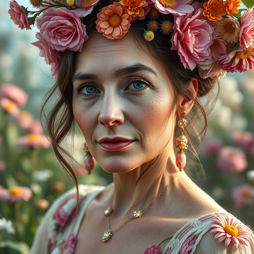 Portrait of a 50-year-old large-boned woman adorned with flowers in her hair, set against an ethereal garden backdrop. The imagery takes inspiration from Anna Dittmann's fantasy art and is featured on cgsociety, capturing a detailed photo made of flowers. The one-shot is captured from a hip-level angle using a Cinestill Hasselblad 50 mm with tilt-shift, enveloped in soft lighting. It exhibits photorealistic, hyperrealistic, and hyperdetailed elements, achieving masterpiece quality in 8k resolution with intricate detailing, a golden ratio composition, and high definition. Her skin displays detailed pores and matte texture, with soft lighting that highlights realistic features enhanced by subsurface scattering and heavy shadow, akin to studio photography. Attention to avoiding visual errors ensures no issues like low resolution, text errors, poor quality, or any deformities in anatomy, maintaining an ultra-realistic portrayal without disruptions such as ugly artifacts, extra limbs, or disfigurement. Subtle modifications maintain the artistic essence while refining attributes like accurate proportions and natural beauty, further enriched by thoughtful creative touches.