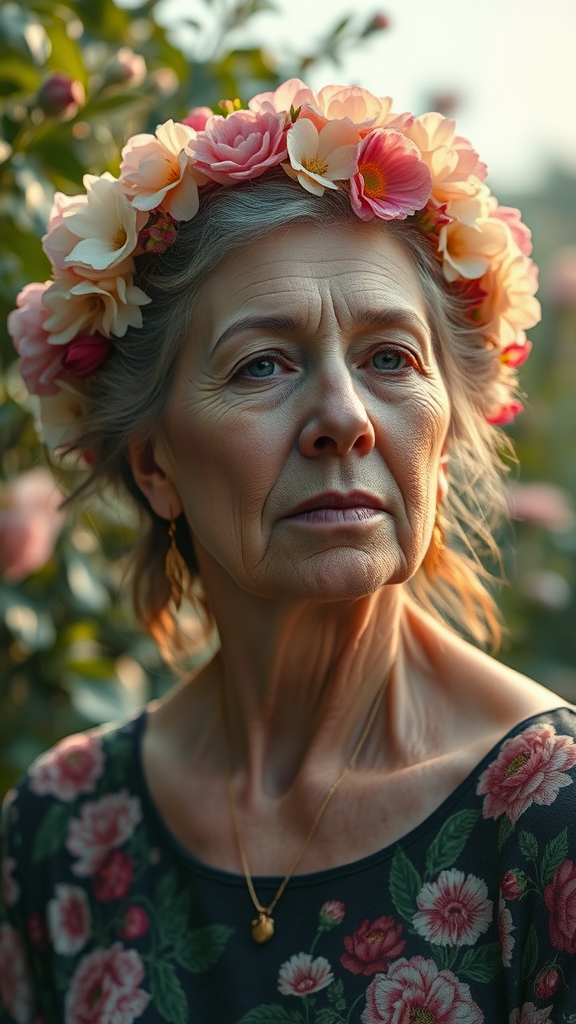 Portrait of a 50-year-old woman with a large-boned frame, adorned with flowers in her hair, set against an ethereal garden backdrop. Inspired by Anna Dittmann and featured on CGSociety, this fantasy art piece is a detailed photo where the subject appears to be made of flowers. The shot is composed from a hip-level angle using a Cinestill Hasselblad 50mm tilt-shift lens, capturing soft, photorealistic lighting. The image is hyperrealistic and highly detailed, exhibiting intricate details like pores and matte skin with subtle subsurface scattering. It is characterized by heavy shadows and studio lighting that emphasize its hyperdetailed, ultra-realistic quality, producing an 8K masterpiece. The composition follows the golden ratio, ensuring high detail in the portrayal of skin and textures. The image avoids any artistic errors, maintaining flawless anatomy and proportions while presenting a visually stunning figure. The setting and subject convey a sense of serene beauty and natural elegance.