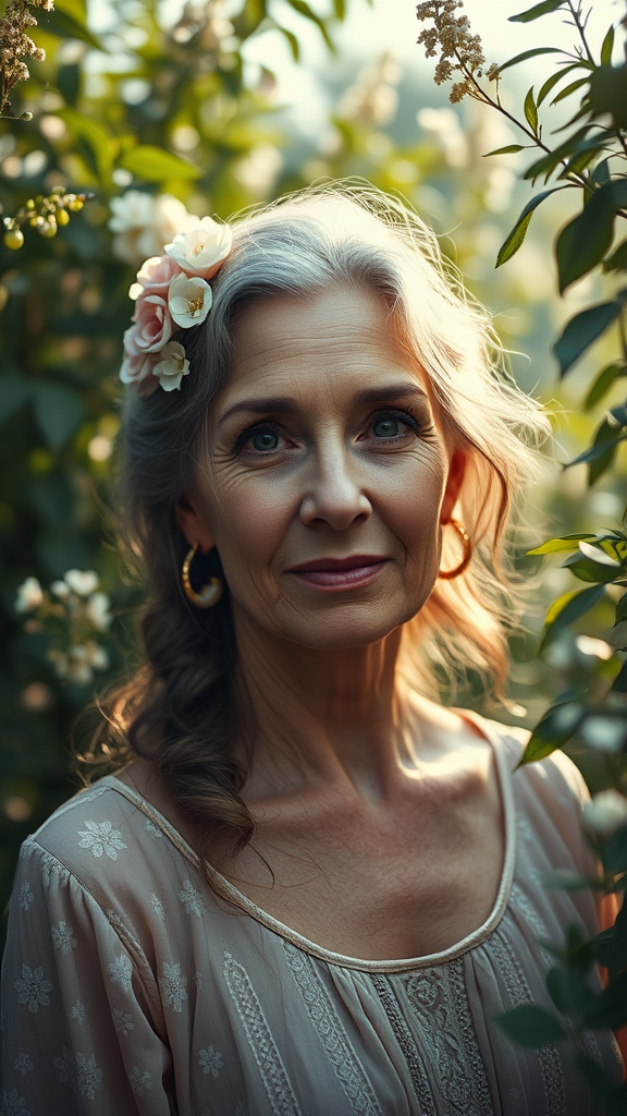 Portrait of a 50-year-old woman with a strong, graceful presence, adorned with delicate flowers in her hair. She stands amidst an ethereal garden, the lush foliage creating a dreamy backdrop reminiscent of Anna Dittmann's fantasy artistry. Captured from a hip-level angle using a Cinestill Hasselblad 50mm lens with tilt-shift, the soft lighting accentuates her detailed, matte skin, revealing pores and the beauty of subsurface scattering. The composition is photorealistic, hyperrealistic, and intricately detailed, achieving a masterpiece of high quality. Every element follows the golden ratio, ensuring an ultra-realistic 8k result. Shadows lend depth to the scene, akin to studio photography. Despite the fantastical setting, realism prevails, avoiding any distortion or imperfections typically associated with low-res or poorly rendered imagery. The woman’s visage is natural and serene, unhindered by defects such as extra limbs or awkward proportions, maintaining her dignity and the image's elegance.