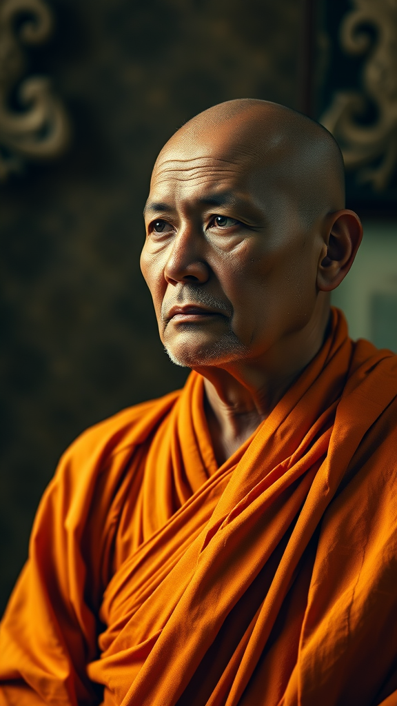 Portrait of a 58-year-old monk gazing into the distance, cinematic composition, captured through 50mm portrait photography. The scene is bathed in hard edge lighting, highlighting his contemplative expression. Dressed in traditional orange robes, the monk's demeanor echoes the philosophical depth associated with Rupert Spira, Sri Ramana Maharshi, and Joan Tollifson. His serious eyes convey wisdom and introspection, embodying the essence of tranquility and profound contemplation. The ambiance is serene, blending artistic photography with an intimate portrayal of enlightenment and inner peace.