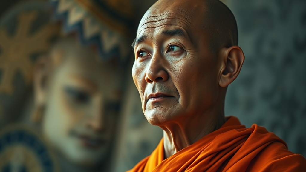 Portrait of a 58-year-old monk gazing thoughtfully into the distance, capturing a cinematic essence with the use of striking hard-edge lighting and a 50mm lens. Clad in vibrant orange robes, the figure embodies a tranquil yet profound presence. His expression, akin to the introspective depth of thinkers like Rupert Spira, Maharshi, and Joan Tollifson, is marked by serious, contemplative eyes. This photographic portrait weaves a narrative of wisdom and inner peace, set against a backdrop that highlights the texture and fine details of both the monk's garments and features.