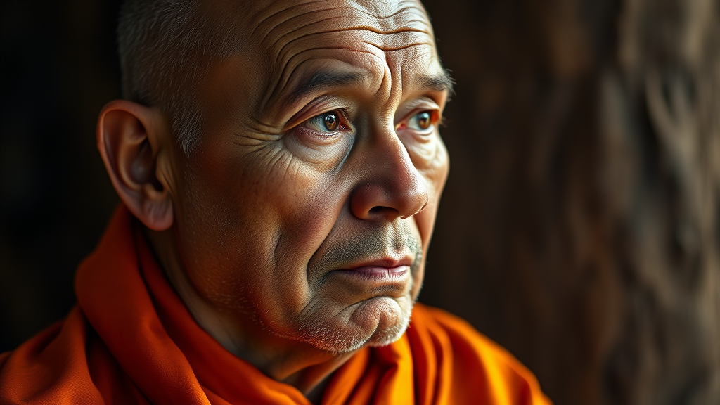 Portrait of a 58-year-old monk in deep contemplation, gazing into the distance, captured in a cinematic style with sharp, defined lighting using 50mm lens photography. Clad in traditional orange robes, the image shares an essence with spiritual thinkers like Rupert Spira, Maharshi, and Joan Tollifson. His serious, introspective eyes convey a profound depth, inviting a sense of tranquility and wisdom. The portrait emphasizes the serenity and complexity of a life devoted to introspection.