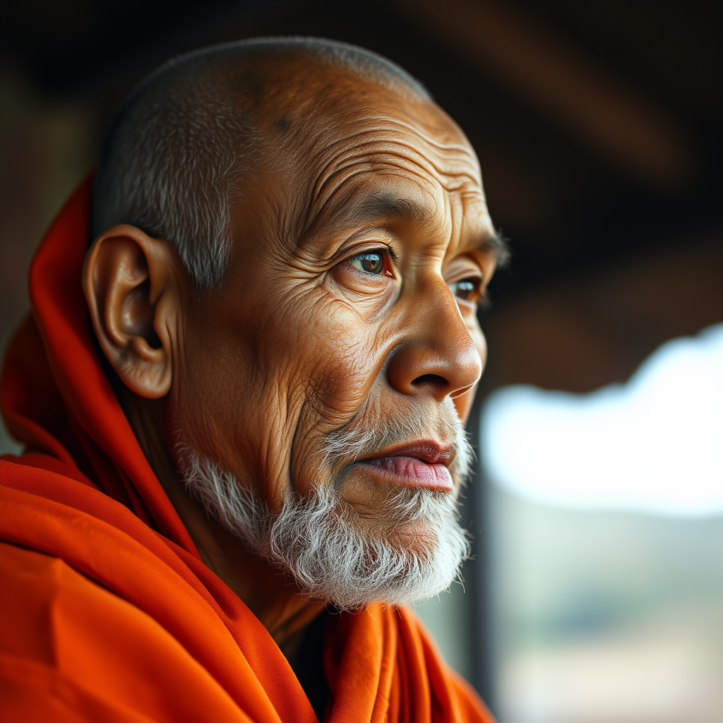 Portrait of a 58-year-old monk looking contemplatively into the distance, captured with cinematic 50mm photography. The image features hard edge lighting, highlighting the texture of his weathered face and the vibrant orange of his robes. The monk's expression is serious and introspective, reminiscent of the wise and serene demeanor of Rupert Spira, Maharshi, and Joan Tollifson. His eyes, deep and thoughtful, suggest a lifetime of spiritual exploration and inner peace. The overall composition combines the artistry of portrait photography with the profound stillness of a meditative moment.