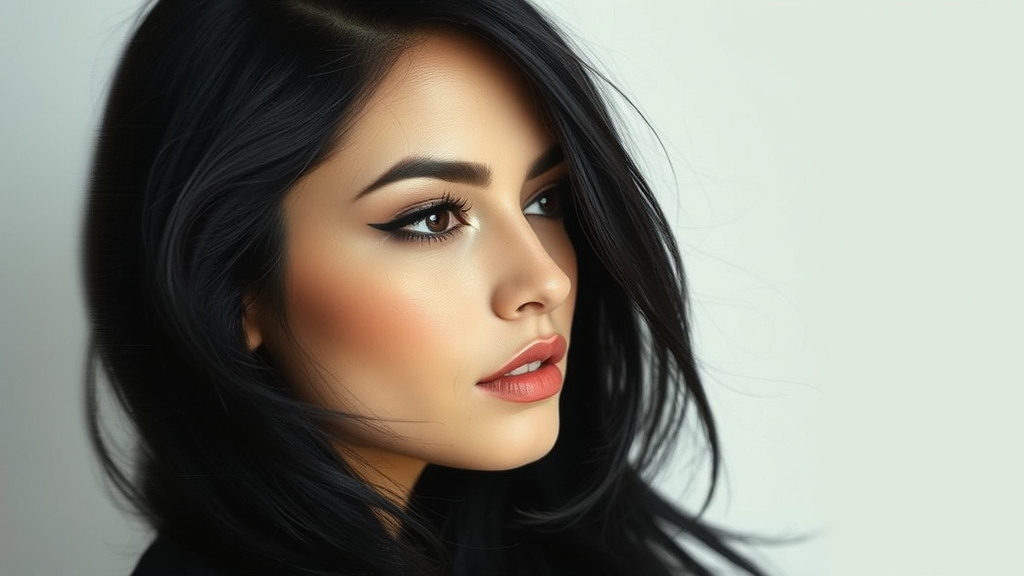 Portrait of a beautiful woman with dark black hair, in a dynamic composition, featuring a side view. The image presents a slightly abstract and surreal quality, with a unique interpretation that includes elements of distortion and artistic expression. The composition may hint at imperfections like blurred lines, exaggerated features, or surreal anatomy, adding to its originality. The aesthetic combines aspects of traditional portraiture with a modern twist, creating a striking and thought-provoking piece.