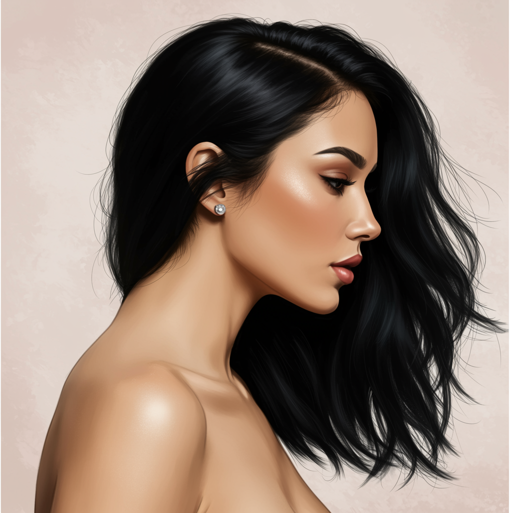Portrait of a beautiful woman with dark black hair in a dynamic composition, capturing elegance and grace. The image highlights her side profile, emphasizing subtle details and an expressive pose. Her features are enhanced by natural lighting that brings out her complexion and hair texture. The composition is artfully balanced, avoiding any distortion or artificial elements, ensuring the scene remains realistic and captivating. The background gently complements the subject, adding depth and context without distraction. The portrait maintains high quality, clarity, and focus, celebrating the artistry of the human form in its true essence.