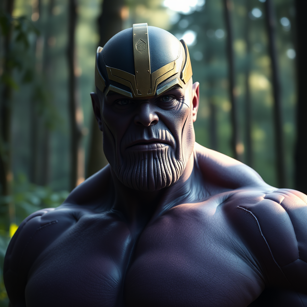 Portrait of a benevolent Thanos in a lush forest of Himachal Pradesh, showcasing clear facial features, broad chest, and a sculpted body, Cinematic style, captured with a 24mm lens at f/2.0, featuring soft accent lighting and natural global illumination, set against an ethereal backdrop, balanced with uplight for added depth, aspect ratio 16:9.