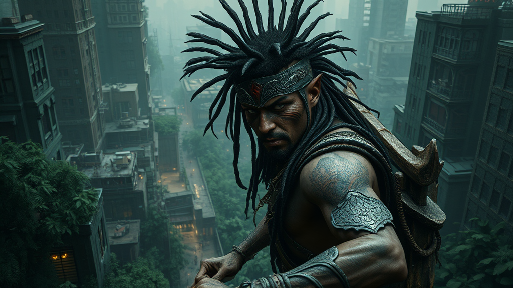 Portrait of a bold tribal warrior navigating a post-apocalyptic city overtaken by lush greenery, crafted in the style of Luis Royo and Greg Rutkowski, featuring dark and gritty tones with intricate details. Volumetric lighting and atmosphere enhance the scene, embodying the essence of concept art and cover illustration. Rendered with octane for high realism, the piece is trending on artstation and presented in 8k resolution, capturing the dynamic pose of the character.