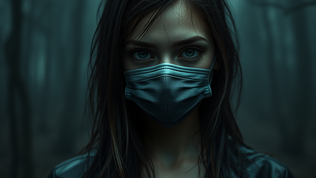 Portrait of a brunette girl wearing a mask, morbid and dark ambiance, incredibly detailed, rendered with Octane precision, glossy and wet texture, surrounded by dense atmospheric mood, epic and dramatic setting, eerily empty and creepy vibe, reminiscent of trail cam footage, photorealistic with hyperornate details, captured in the style of Haris Nukem with a unique creative twist.