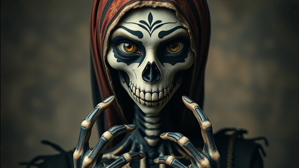 Portrait of a captivating figure, adorned with a headscarf, embodying the spirit of Día de los Muertos with a gothic flair. The image features intriguing details such as a duplicated face, unique mutations, and a cross-eyed expression. The figure possesses a long neck and hands with extra fingers, creating an otherworldly appearance. The image conveys a sense of mystery, with elements slightly out of frame, a touch of blurriness, and subtle imperfections reminiscent of vintage photography, such as soft focus and light artifacts. The overall composition remains expressive, avoiding clear logos, text, or cartoonish elements, capturing the enigmatic essence of the subject.