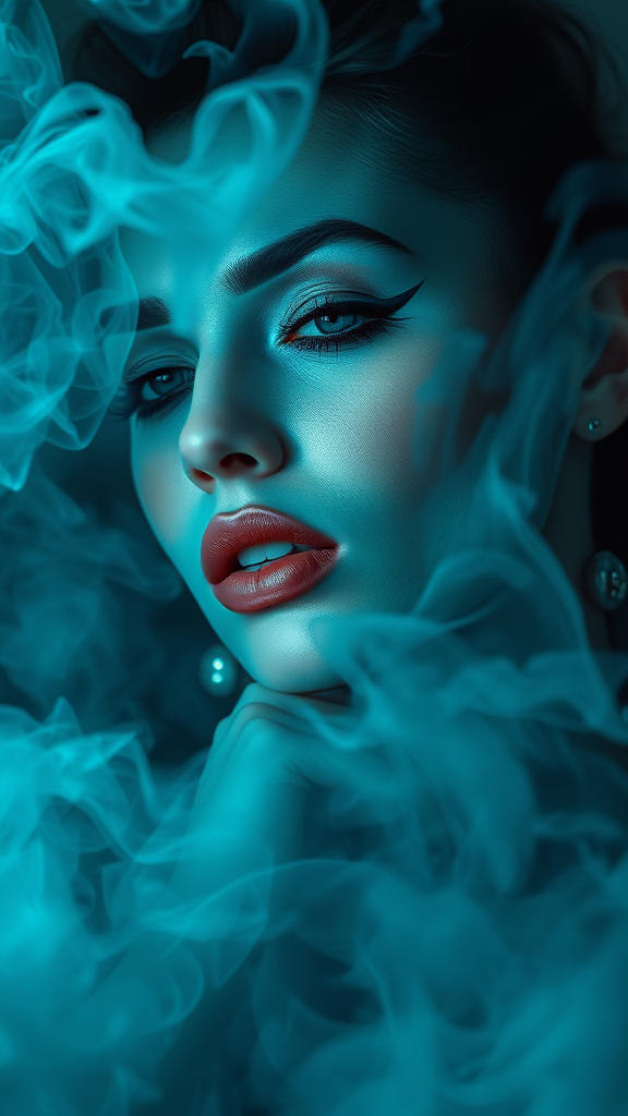 Portrait of a captivating woman enveloped in a swirling mist of smoke, featuring ethereal cyan highlights and elegant cyan make-up, with subtle touches of pastel hues. The scene is imbued with a mysterious allure, evoking a seductive and sultry aura. Rendered in an oil painting style, the piece embodies the essence of modern aesthetic art through hyper-realistic detail, capturing a breathtaking and mesmerizing vision.