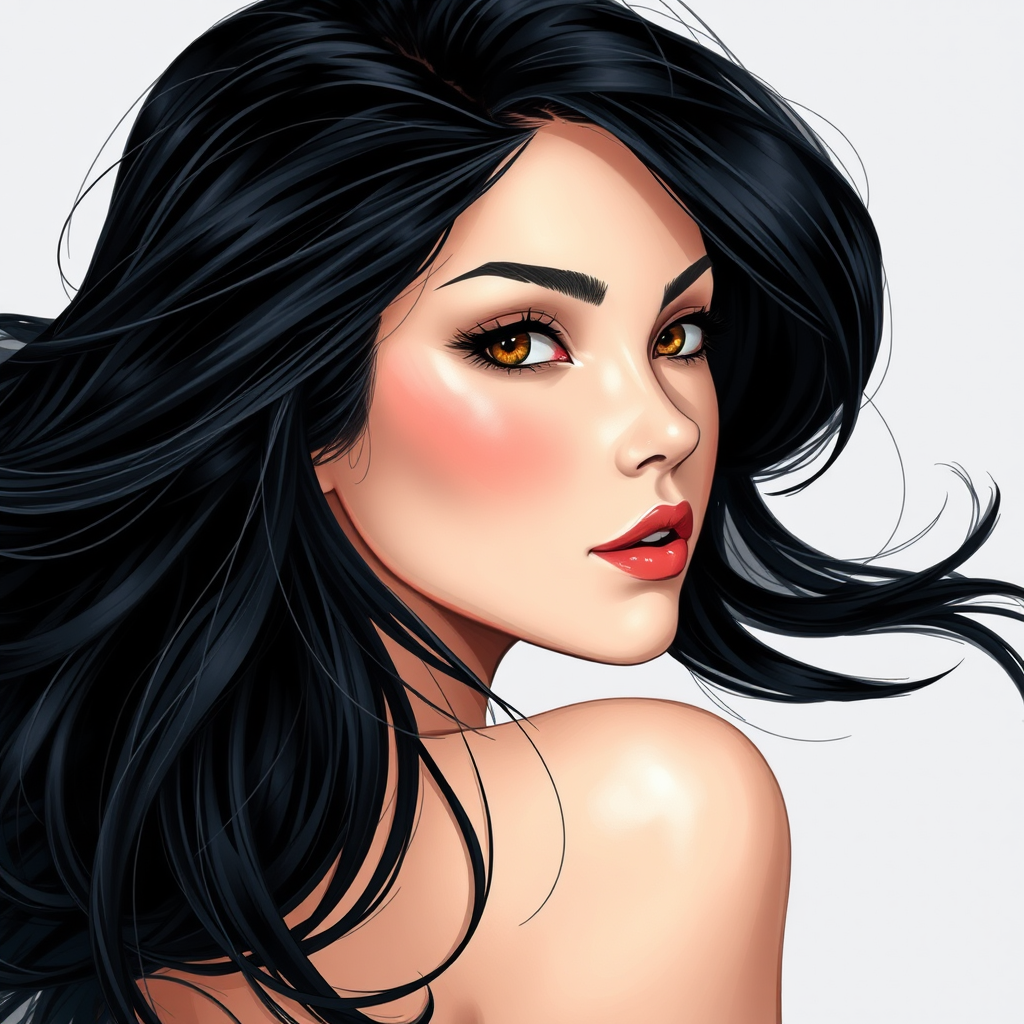 Portrait of a captivating woman with dark black hair, set in a dynamic composition. The image maintains clarity, avoiding issues like poor quality, jpeg artifacts, or blurriness. It features a tasteful side view, steering clear of any elements that might be considered nsfw or overly stylized like cgi or 3d. The woman's features are beautifully drawn, with attention to natural anatomy, avoiding any disfigurement or exaggerations such as extra limbs or long necks. The artistic interpretation leans towards elegance rather than kitsch or oversaturation, capturing her essence with a refined touch.