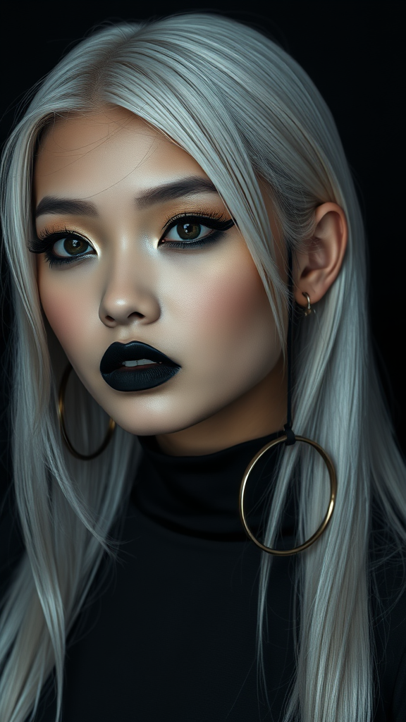 Portrait of a captivating young goth girl with striking black lipstick and dramatic black eyeliner, her sleek silver-white hair cascading gracefully, adorned with large round metallic earrings that catch the light. The image has a subtle film grain effect, enhancing its high-quality, artistic feel. Captured in a professional studio setting against a deep, textured black backdrop with a Nikon D850, the subject is an enigmatic Asian beauty, exuding a confident and mysterious allure.
