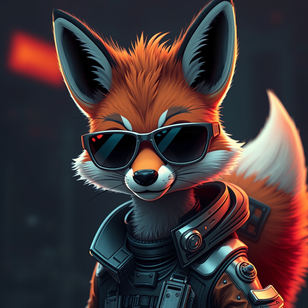 Portrait of a cartoon fox with sleek sunglasses, embodying the vray tracing style with a neonpunk twist. The fox is adorned in intricate, futuristic costumes, exuding a cool and detached vibe. The scene is captured with photo-realistic techniques reminiscent of the Konica Big Mini, resulting in an ultra-highly detailed image. Presented in 8k resolution with sharp focus, the atmosphere is both cold and enigmatic, maintaining a balance between whimsy and sophistication.