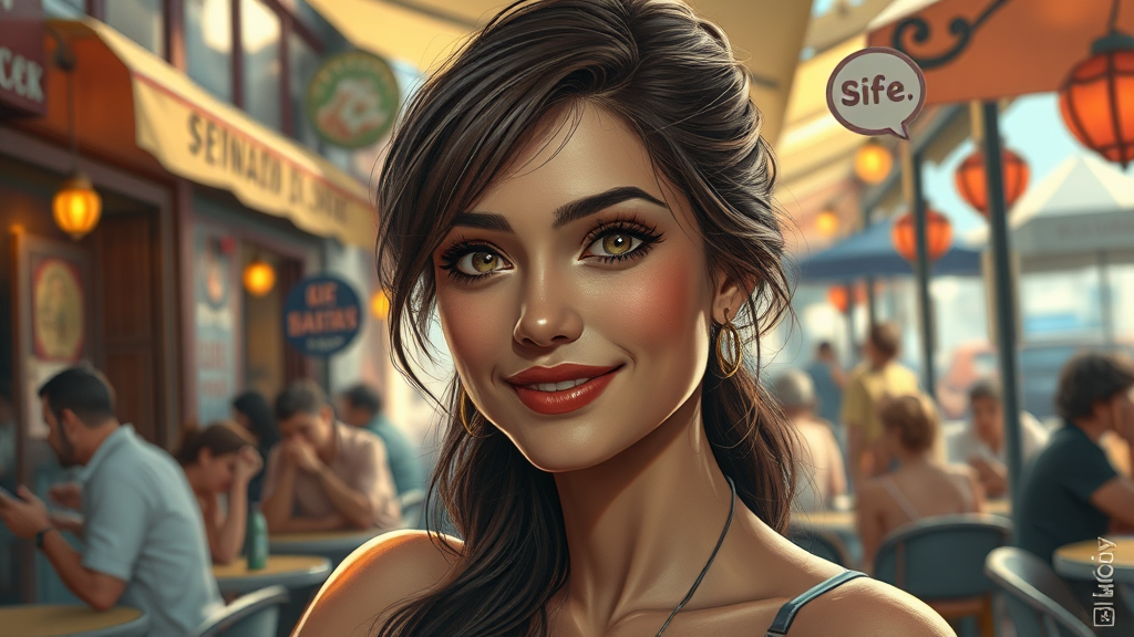 Portrait of a charming brunette with a gentle smile, intricate facial details set against the backdrop of a bustling summer café, highly detailed concept art in a hyperrealistic style, cinematic lighting, digital art painting inspired by Greg Rutkowski, touch of surrealism, vibrant atmosphere, includes whimsical elements such as playful stickers, subtle markings, and lively speech bubbles. The scene captures a dynamic yet intimate moment, maintaining core elements while introducing a hint of artistic mystique.