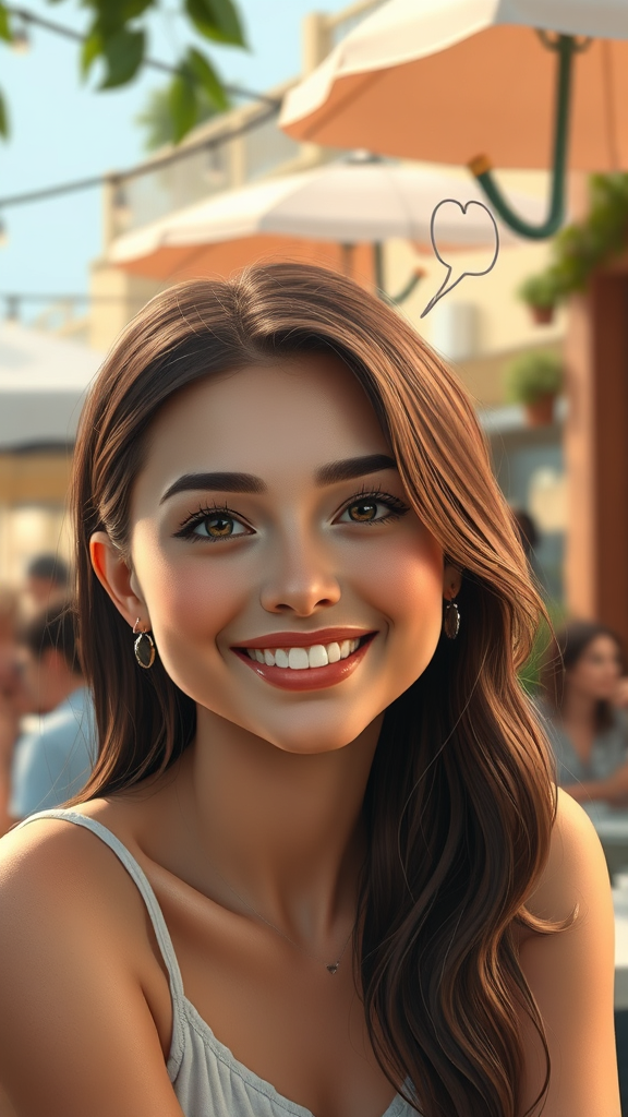 Portrait of a charming brunette with a warm smile, showcasing a detailed and expressive face against the lively backdrop of a summer café, rendered in hyperrealistic style with cinematic lighting. This digital art painting—reminiscent of Greg Rutkowski's 3D artworks—features intricate details and concept art aesthetics. Soft pastel colors add a dreamy quality, while subtle elements like floating speech bubbles and whimsical lines lend a playful touch. The composition focuses on high resolution and clarity, ensuring a polished and vibrant finish, free from visual distractions or imperfections.