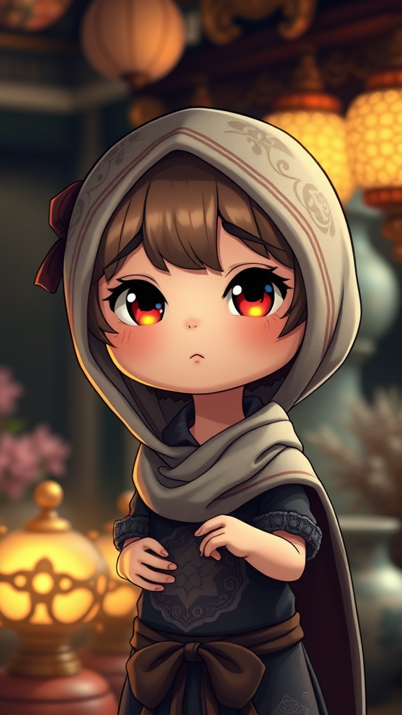 Portrait of a charming chibi character, wearing a head scarf, set in a cinematic scene with ambient lighting. The image is rich in intricate detail and ornate design, presented in 8k resolution with UHD and HDR quality. The character features a quirky expression with a cloned face, cross-eyed look, and a long neck. There are also unique aspects like extra fingers and creatively adjusted hands. The background blends seamlessly but remains slightly abstract, with elements softly out of frame, slightly blurred, and subtly texturized with jpeg-like artifacts. Hints of text and unintentional elements like watermarks or logos might appear, echoing a whimsical, cartoon-like narrative, including split or merged images that add to its distinctive charm.