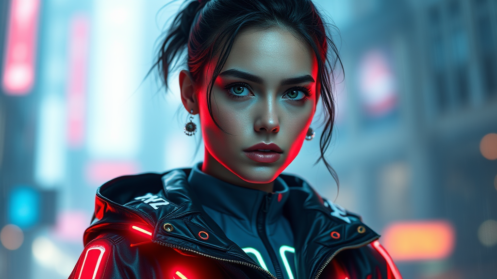 Portrait of a European pretty young woman wearing a stylish storm rain movie jacket coat, embodying a fusion of futuristic sci-fi fashion and royal allure. She stands with a perfect face, sharp chin, and intricately detailed features. Her expression reflects the essence of cyberpunk and neotokyo aesthetics, with influences from synth-wave and Bladerunner scenes, emphasizing dramatic lighting. The jacket is adorned with low-emission neon elements, blending seamlessly with the hyper-realistic lifelike texture of her visage. Her attire, reminiscent of designs by Ismail Inceoglu, Dragan Bibin, Hans Thoma, Greg Rutkowski, and others, exudes a cinematic quality. The image is a professional high-definition photo, capturing ultra-high resolution details with rich colors and high contrast, achieved through physics-based rendering. This digital artwork, a blend of CGI realism and illustration, speaks to both photography and digital painting realms, all while maintaining a harmonious balance of futuristic, elegant design and artistic expression.