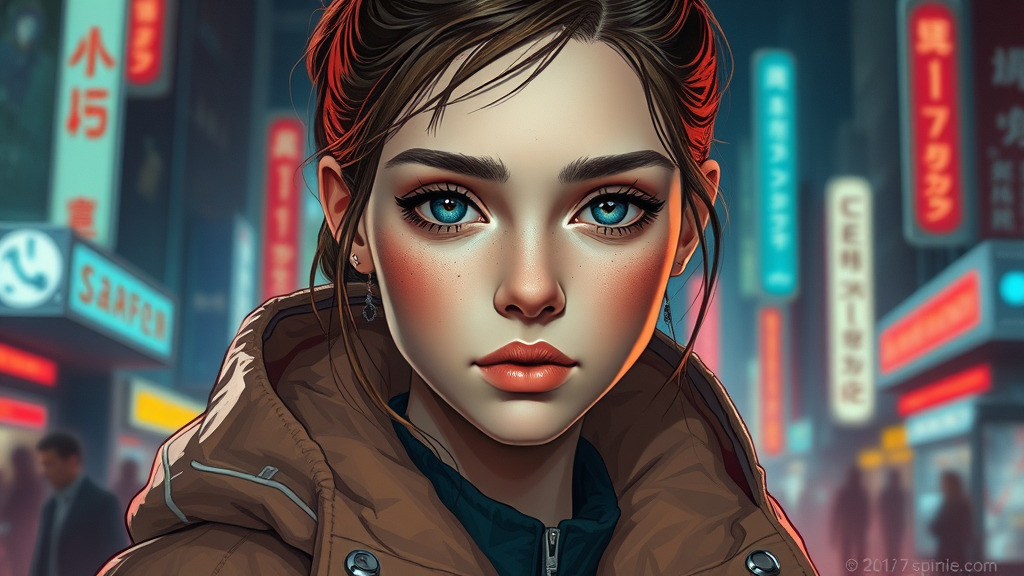 Portrait of a European young girl with a striking appearance, wearing a movie-inspired rain jacket and coat with a futuristic sci-fi edge and hints of royal attire. Influences by artists like Ismail Inceoglu, Dragan Bibin, Hans Thoma, Greg Rutkowski, Alexandros Pyromallis, Nekro, and Rene Magritte. The illustration features a perfect face with a sharp chin and fine details, achieving a realistic shaded effect. Embodying cyberpunk, neotokyo, and synthwave aesthetics, the scene is awash in low-emission neon reminiscent of the Bladerunner movie atmosphere. The character has a doll-like quality with attention to elegant proportions and lifelike anatomy. The backdrop complements the futuristic theme with elements of a dynamic and vibrant cityscape.