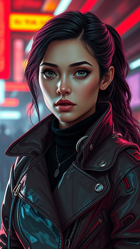 Portrait of a European young woman wearing a stylish movie-inspired jacket, blending futuristic sci-fi fashion with regal elements. Inspired by artists like Ismail Inceoglu, Dragan Bibin, and Hans Thoma. Her perfect, finely detailed face features a sharp chin and clear, realistic shading, embodying the aesthetic of cyberpunk and neotokyo. Set against a synthwave backdrop with low-emission neon lights reminiscent of a Blade Runner scene, her attire merges high-tech and elegance, creating a visionary look. The portrait captures her in a moment that bridges the gap between classic art and modern cinematics, combining elements of surrealism with a cutting-edge fashion statement.