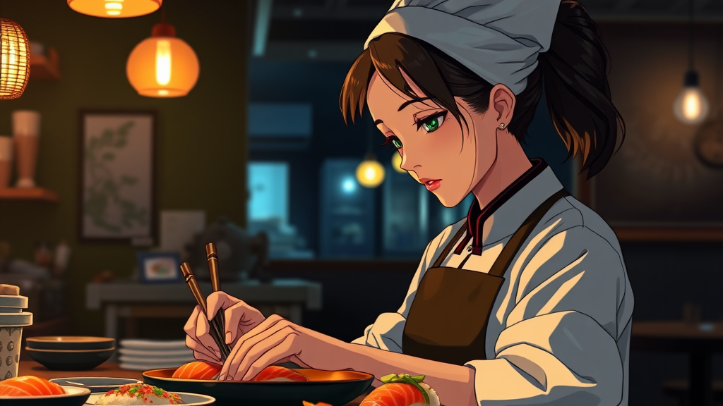 Portrait of a female chef skillfully crafting sushi at her restaurant during nighttime, inspired by the art style of Lois van Baarle and anime; the scene captures the warm ambiance with dimmed lights, highlighting her focused expression. The chef's traditional attire and precise movements emphasize her expertise and passion for her craft. Her hair elegantly tied back, allowing a clear view of her serene face. Subtle elements of anime art add charm, while maintaining anatomical correctness and clear imagery, avoiding blurs or distortions, and ensuring a captivating, inviting atmosphere.